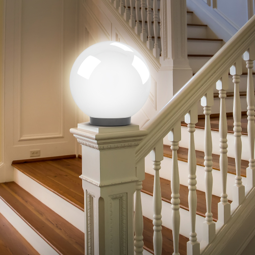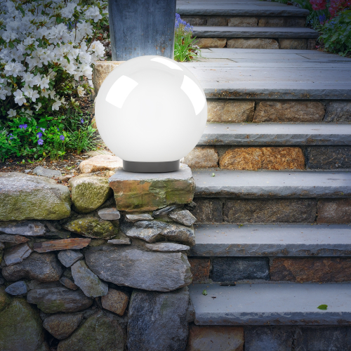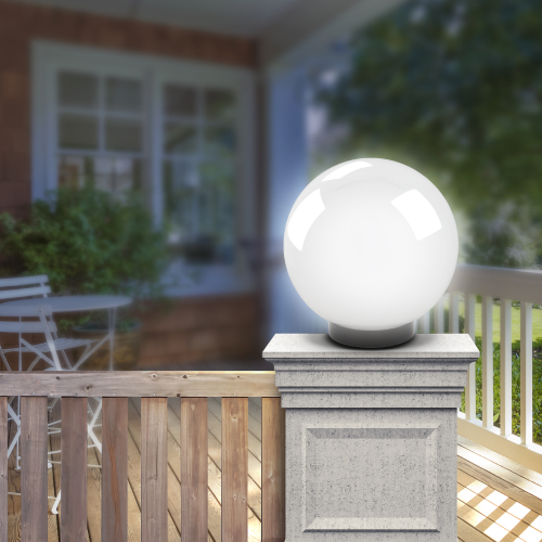 Дизайн с учетом европейских тенденций в освещении. Не подвержен коррозии, деформации под воздействием погодных условий (основание выполнено из поликарбоната, рассеиватель- полиметилметакрилата). Подходит любая светодиодная лампа, имеющая габариты не более D118мм, H=«D шара»-30мм