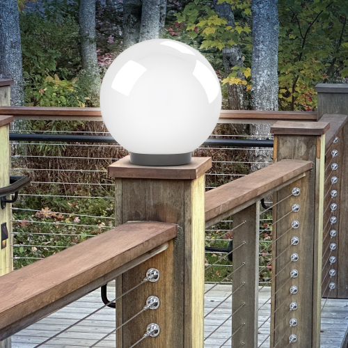 Дизайн с учетом европейских тенденций в освещении. Не подвержен коррозии, деформации под воздействием погодных условий (основание выполнено из поликарбоната, рассеиватель- полиметилметакрилата). Подходит любая светодиодная лампа, имеющая габариты не более D118мм, H=«D шара»-30мм