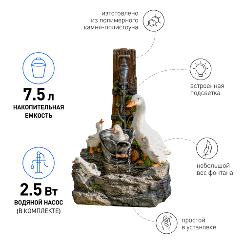 Уличный садовый фонтан со светодиодной подсветкой Green Apple GANF-07 «Гуси» имеет интересный сюжет – купающаяся гусыня с гусятами. Корпус из искусственного камня-полистоуна не раскрошится под прямыми солнечными лучами и осадками. Стойкое окрашивание сохранит красивые естественные цвета фонтана на долгие годы. Фонтан уличный садовый Green Apple «Гуси» выглядит очень реалистично и прекрасно дополняет атмосферу загородного отдыха. Высота фонтана – 59 см.