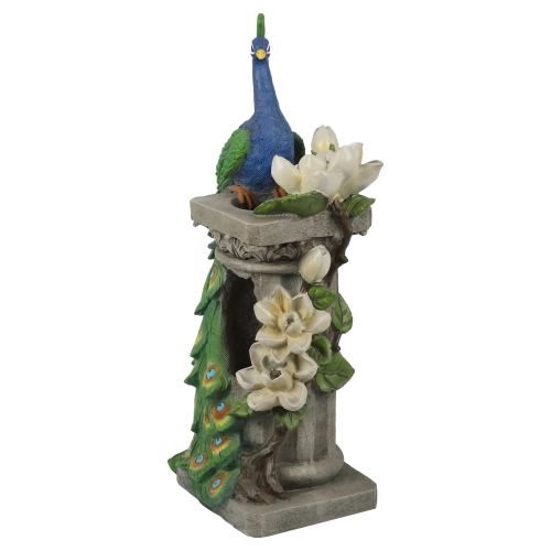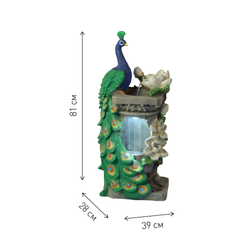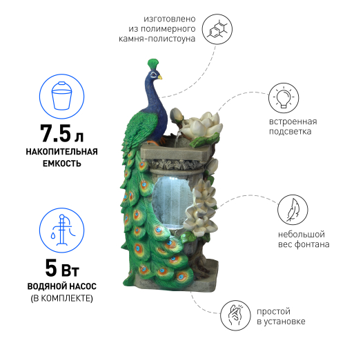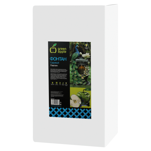 Green Apple GANF-08 «Павлин» - уличный садовый фонтан с оригинальным дизайном и светодиодной подсветкой. Высота фонтана – 81 см. Декоративный фонтан представляет собой эффектную колонну с цветущими ветками, на колонне сидит красиво распушивший хвост павлин. LED-подсветка делает эту садовую декорацию заметной даже в тёмное время суток. Фонтан уличный изготовлен из прочного полистоуна – искусственного камня, устойчивого к механическим повреждениям и воздействию окружающей среды. В комплекте водяной насос, направляющий воду вверх. Экономичная замкнутая система с накопительной ёмкостью 7,5 литров. Мощность насоса – 5 Вт.