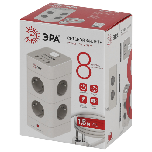 Сетевой фильтр Эра TWR-8es-1,5m-4USB-W рассчитан на одновременное подключение большого количества техники. На корпусе расположены 8 розеток с заземлением. Прочный корпус в виде башни из негорючего поликарбоната. Блок защиты подключаемых устройств включает термореле для защиты от короткого замыкания и перегрузки. При нагреве из-за превышения нагрузки термореле срабатывает и обесточивает все подключенные устройства. Трехжильный провод ПВС обеспечивает допустимую максимальную нагрузку до 3680 Вт. Правильно подбирайте бытовые приборы, чтобы не превышать общую нагрузку на сетевой фильтр. 4xUSBA+C 3,4A 5В~ 18Вт. Длина провода модели составляет 1,5 метра. Удлинитель удобно использовать в пределах одной комнаты.