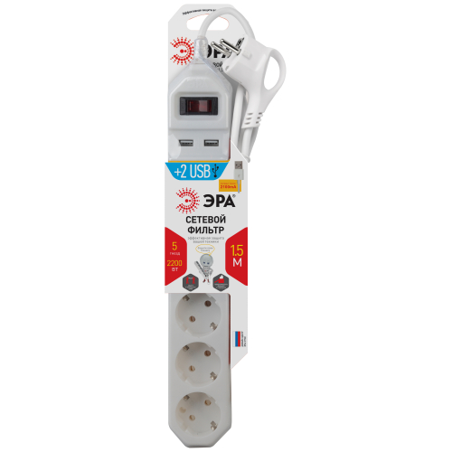 Сетевой фильтр удлинитель Эра USF-5es-1.5m-USB-W с заземлением, с выключателем, 2USB, ПВС, 3x0,75мм2, 5 розеток, 1,5 м. Базовый уровень защиты техники: от имупльсных помех, от перегрузки, от короткого замыкания. Максимальная мощность 10А/2200 Вт. Корпус из ударопрочного и не горючего пластика (поликарбонат). Вилка обеспечена кольцом для удобного извлечения ее из розетки. Присутствует отверстие для крепления сетевого фильтра на разные поверхности. Отлично подойдет для защиты бытовой и компьютерной техники. Например: компьютеров, стиральных машин и кухонных бытовых приборов. Сетевой фильтр оснащен 2USB для зарядки мобильных устройств. Дизайн сетевого фильтра разработан в России командой Эра Slyle.