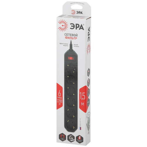 Сетевой фильтр Эра USF-6es-1,5m-B рассчитан на одновременное подключение большого количества техники. На корпусе расположены 6 розеток с заземлением. Отличительной особенностью модели выступает прочный корпус из негорючего полипропилена, надежный трехжильный провод, терморазмыкатель на 10А, который защищает приборы от перегрузки, и варистор, защищающий подключенные устройства от импульсных помех. На корпусе расположена кнопка выключения. Сетевой фильтр разработан собственными инженерами компании ЭРА, проходят проверку на всех этапах производства, гарантируя высокое качество его исполнения. Длина провода модели составляет 1,5 метра. Удлинитель удобно использовать в пределах одной комнаты. Сетевой фильтр имеет кольцо на шнуре, благодаря чему прибор можно быстро выдернуть из сети.