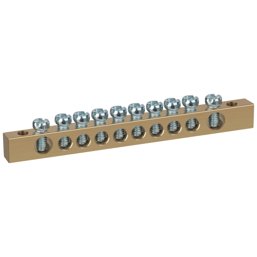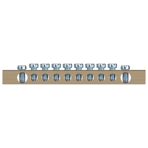 Шины латунные PEN "земля-ноль" применяются для электрического и механического соединения нулевых, защитных и фазных проводников в электрических щитах и распределительных устройствах. Изделия выполняются из латуни соответствующего сечения с отверстиями обладающими винтовыми зажимами для подключения проводников.