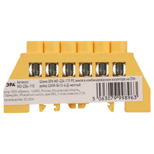 Изделие выполнено из латунной шины сечением 8×12 мм установленной в пластиковый комбинированный изолятор жёлтого цвета.
