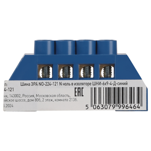 Изделие выполнено из латунной шины сечением 6×9 мм установленной в пластиковый изолятор синего цвета.