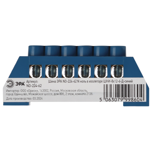 Изделие выполнено из латунной шины сечением 8×12 мм установленной в пластиковый изолятор синего цвета.