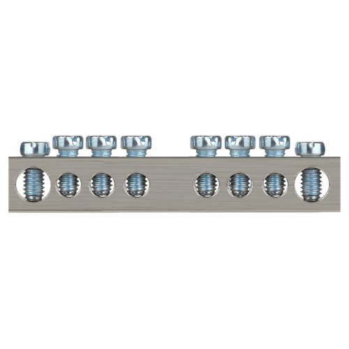 Изделие выполнено из латунной шины сечением 6×9 мм с никелированным покрытием для высокой коррозионной стойкости материала и позволяет одновременно подключать проводники из меди и алюминиевого сплава серии 8000.
