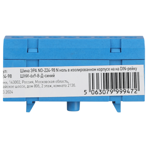 Изделие выполнено из латунной шины сечением 6×9 мм установленной в пластиковый изолятор синего цвета.
