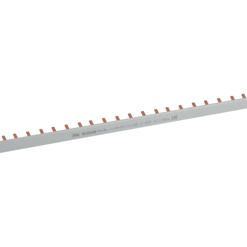 Особенности конструкции: - На корпусе изделия лазерной гравировкой нанесены технические характеристики. - Токоведущая часть изготовлена из электротехнической меди марки М1. - На контактных частях шины выполнены насечки, которые обеспечивают надёжную фиксацию в корпусе модульного аппарата. - Материал изолированного корпуса не поддерживает горение.