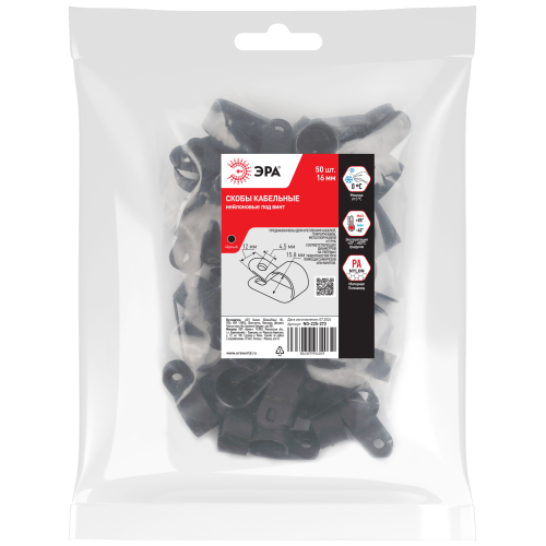 Скобы крепежные нейлоновые под винт ЭРА предназначены для фиксации отдельных кабелей, пучка проводов, гофрорукавов соответствующих диаметров. Это один из наиболее экономичных видов крепежа. Вы самостоятельно можете выбрать наиболее подходящий либо имеющийся у вас в наличии вид крепежа данной скобы к поверхности: саморез, винт с дюбелем и т. п.