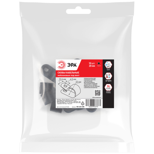 Скобы крепежные нейлоновые под винт ЭРА предназначены для фиксации отдельных кабелей, пучка проводов, гофрорукавов соответствующих диаметров. Это один из наиболее экономичных видов крепежа. Вы самостоятельно можете выбрать наиболее подходящий либо имеющийся у вас в наличии вид крепежа данной скобы к поверхности: саморез, винт с дюбелем и т. п.