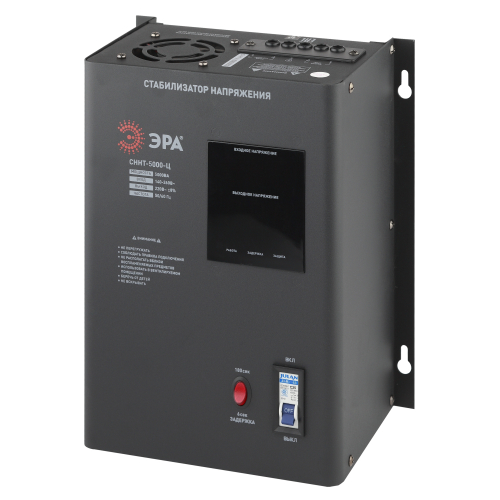 Стабилизатор напряжения настенный однофазный релейный цвет чёрный модели СННТ-5000-Ц. Номинальные характеристики (полная мощность / диапазон входного напряжения): 5000ВА 140-260В . Предназначен для поддержания стабильного однофазного напряжения питания бытовых приборов при отклонениях значений сетевого напряжения. Выбирая стабилизатор, нужно знать, какое электрооборудование будет к нему подключено: один прибор, группу приборов (наиболее чувствительных к перепадам напряжения в сети) либо вся домашняя (офисная) техника. Затем необходимо рассчитать суммарную мощность защищаемых электропотребителей. Основное условие выбора мощности стабилизатора напряжения - суммарная мощность подключаемой к нему нагрузки не должна превышать полной мощности самого стабилизатора (в противном случае автоматика стабилизатора будет их просто отключать). Точные значения мощности можно узнать из паспортных данных Вашего конкретного потребителя. Стабилизатор подбирается с запасом в 25-30% к его полной мощности.