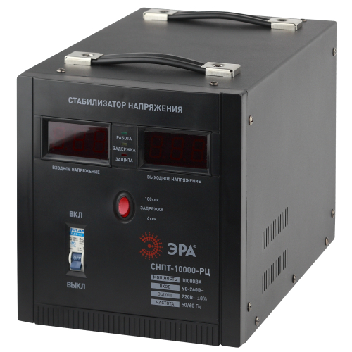 Стабилизатор напряжения переносной / напольный однофазный релейный цвет чёрный модели СНПТ-10000-РЦ. Номинальные характеристики (полная мощность / диапазон входного напряжения): 10000ВА. Предназначен для поддержания стабильного однофазного напряжения питания бытовых приборов при отклонениях значений сетевого напряжения. Выбирая стабилизатор, нужно знать, какое электрооборудование будет к нему подключено: один прибор, группу приборов (наиболее чувствительных к перепадам напряжения в сети) либо вся домашняя (офисная) техника. Затем необходимо рассчитать суммарную мощность защищаемых электропотребителей. Основное условие выбора мощности стабилизатора напряжения - суммарная мощность подключаемой к нему нагрузки не должна превышать полной мощности самого стабилизатора (в противном случае автоматика стабилизатора будет их просто отключать). Точные значения мощности можно узнать из паспортных данных Вашего конкретного потребителя. Стабилизатор подбирается с запасом в 25-30% к его полной мощности.