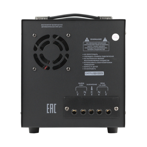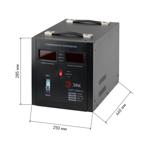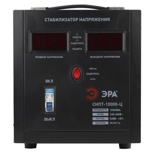 Стабилизатор напряжения переносной/напольный однофазный релейный цвет чёрный модели СНПТ-10000-Ц. Номинальные характеристики (полная мощность / диапазон входного напряжения): 10000ВА 140-260В . Предназначен для поддержания стабильного однофазного напряжения питания бытовых приборов при отклонениях значений сетевого напряжения. Выбирая стабилизатор, нужно знать, какое электрооборудование будет к нему подключено: один прибор, группу приборов либо вся домашняя (офисная) техника. Затем необходимо рассчитать суммарную мощность защищаемых электропотребителей. Основное условие выбора мощности стабилизатора напряжения - суммарная мощность подключаемой к нему нагрузки не должна превышать полной мощности самого стабилизатора (в противном случае автоматика стабилизатора будет их просто отключать). Точные значения мощности можно узнать из паспортных данных Вашего конкретного потребителя. Стабилизатор подбирается с запасом в 25-30% к его полной мощности.