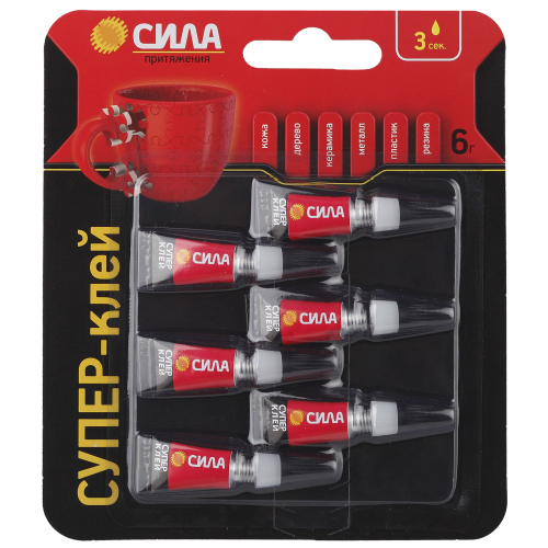 Супер-клей СИЛА, идеально подходит для быстрого и эффективного ремонта различных предметов мебели, интерьера и т.д. Накрепко схватывает дерево, резину, керамику, фарфор и пластик, при этом супер клеи экономично расходуются и высыхают за несколько секунд.