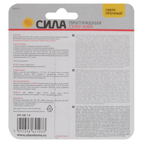 Супер-клей СИЛА, идеально подходит для быстрого и эффективного ремонта различных предметов мебели, интерьера и т.д. Накрепко схватывает дерево, резину, стекло, фарфор и пластик, при этом супер клеи экономично расходуются и высыхают за несколько секунд. 100% цианоакрилат - высокая концентрация клеящих ингредиентов, обеспечивает крепкое, мгновенное соединение частей различных предметов. Удобный само вскрывающийся тюбик - при накручивания колпачка, обеспечивает быстрое и аккуратное использование. Предусмотрена перфорация "ёлочка" под тюбиком для извлечения его быстро и без усилий. Не засыхает после первого использования. Объем тюбика рассчитан таким образом, что содержимое не высыхает в течение всего времени использования моментального супер-клея. Идеален для ремонта предметов из различных материалов: дерева, стекла, резины, металла, кожи, керамики и др.