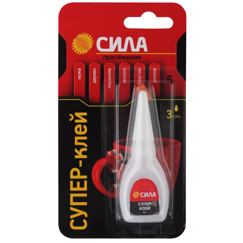 Супер-клей СИЛА, идеально подходит для быстрого и эффективного ремонта различных предметов мебели, интерьера и т.д. Накрепко схватывает дерево, резину, стекло, фарфор и пластик, при этом супер клеи экономично расходуются и высыхают за несколько секунд. Прочный клеевой шов. Клеевое соединение устойчиво к органическим растворителям.