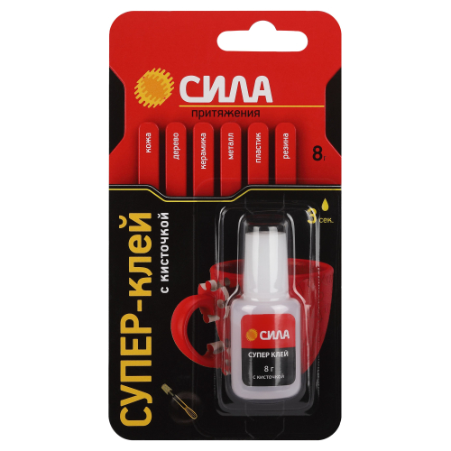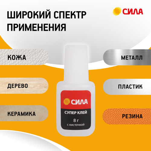 Супер-клей «СИЛА» с кисточкой подходит для склеивания изделий из различных материалов, таких как металл, дерево, керамика, кожа, кожезаменитель, резина, картон, пластик.