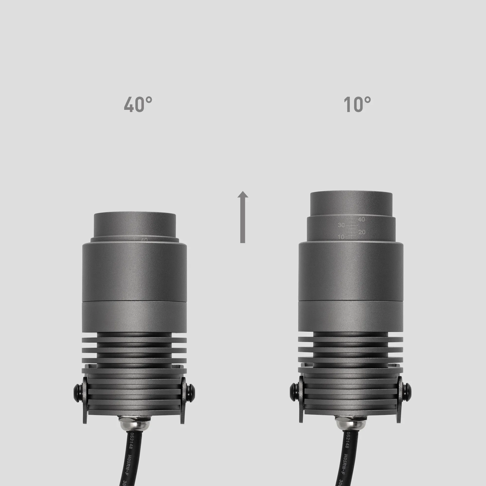 Уличный светодиодный прожектор ALT-RAY-ZOOM-R52-8W Warm3000 (DG, 10-40 deg, 230V) мощностью 8 Вт теплого цвета свечения (2700 К) предназначен для организации локального освещения элементов фасадов зданий и сооружений, малых архитектурных форм, деревьев и зеленых насаждений. Поворотная конструкция корпуса позволяет мгновенно регулировать направление света в вертикальной плоскости в диапазоне 135°. Изменяемый угол излучения 10-40° и световой поток 240-420 лм дает возможность решать задачу точечного освещения объектов. Ударопрочный корпус Ø52хН103 мм темно-серого цвета выполнен из алюминия с устойчивым анодно-оксидным покрытием. Оптический блок закрыт прочным экраном из закаленного стекла толщиной 3мм. Степень пылевлагозащиты светильника IP67 рассчитана на длительное использование на открытом воздухе, обеспечивая надежную работу в неблагоприятных условиях. Встроенный драйвер позволяет безопасно и быстро подключить светильник к сети 230В, а для удобства монтажа в комплект входит провод длиной 1м. Возможна установка в грунт или на поверхность при помощи дополнительных аксессуаров — основания-пики или круглого основания (приобретаются отдельно).