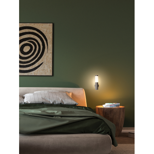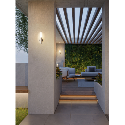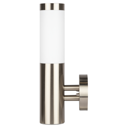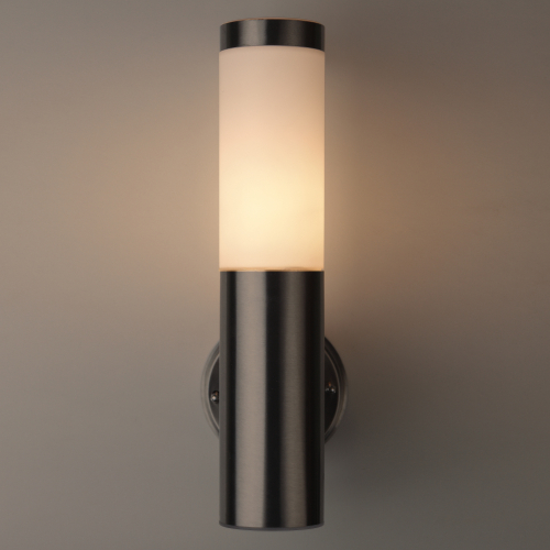 Светильник декоративный настенный WL17 создает интересные световые композиции, подчеркивает структуру материалов. Подходит для наружного уличного освещения и влажных помещений. Цоколь для источника света E27, напряжение питания 220В ~50/60Гц, материал нержавеющая сталь + пластик, цвет светильника хром/белый, размер 150*360*118 мм, D76 мм, максимальная мощность лампы 50 Вт, степень защиты IP44