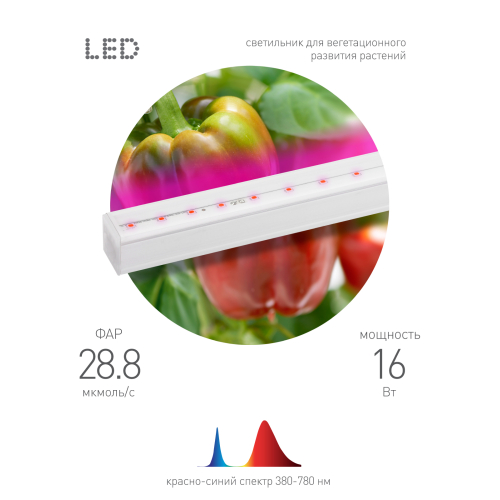 Светильник для растений ЭРА FITO-16W-Т5-N предназначен для рассады пасленовых, выращивания зелени на подоконнике и досвечивания комнатных цветов. Красно-синий спектр обеспечивает питание корней и листьев, предотвращает вытягивание. Рекомендованное расстояние размещения от 5 до 35 см. Увеличение диапазона между растениями и светильником уменьшает эффект от использования обратно пропорционально квадрату расстояния. Аккуратный и лаконичный дизайн позволит модели легко вписаться в интерьер балкона или кухни. Главные преимущества линейной фитолампы установка, которая не займет много времени, и равномерно распределенный свет. Свечение от нее совершенно безопасно для человека и животных. Корпус модели выполнен из прочного пластика. В упаковке Вы найдете провод для подключения к сети, защитный колпачок и крепления. Светодиодная лампа для растений это долговечность и экономия затрат на электроэнергию. Диоды в светильнике работают в дефорсированном режиме, что обеспечит ему долгий срок службы и хорошую светоотдачу. Создайте для любимых растений комфортные условия, а себя обеспечьте большим урожаем вместе с фитолампой ЭРА!