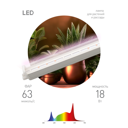 Линейный фитосветильник полного спектра мощностью 18 Вт. Свет фитолампы максимально приближен к естественному солнечному, что стимулирует фотосинтез и способствует активному развитию растений. Светодиодная технология обеспечивает низкое энергопотребление. Лёгкий и быстрый монтаж в любом удобном месте — над рассадой, комнатными цветами или в теплице. Компактный и лаконичный дизайн гармонично впишется в любой интерьер. Мощная и экономичная досветка для растений круглый год.