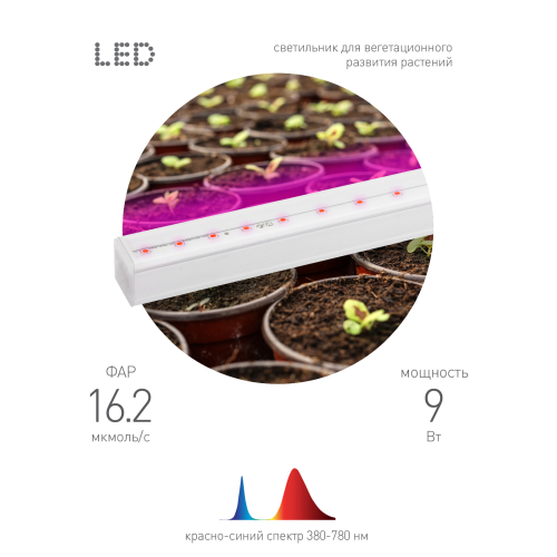 Мощность — 9 Вт. Габариты: 573 х 22 х 34,5 мм. В комплект входит провод для подключения изделия к электросети 220 в, защитный колпачок для использования светильника как одиночного осветительного прибора, а также крепления для размещения прибора в удобном месте над растениями (в том числе для подвешивания на тросы).