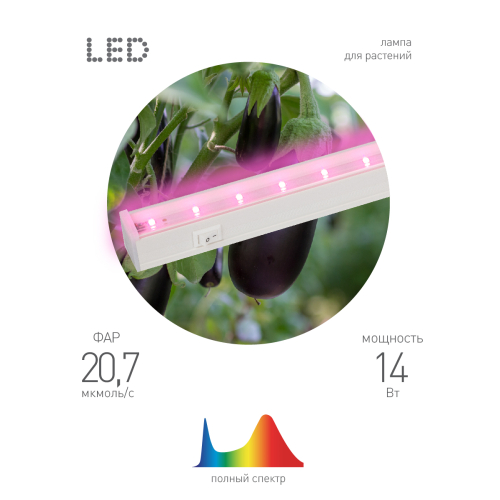 Светодиодный светильник линейный для растений 14 Вт ЭРА LLED-05-T5-FITO-14W-W предназначен для активации роста цветов и рассады. Вы можете поставить фитолампу как у себя в квартире, так и в парнике - она отлично впишется в интерьер любого помещения. Коэффициент пульсаций составляет 0,5%, а потому свет не будет раздражать и не доставит неудобств домашним. К несомненным преимуществам нашего линейного светильника относятся также простая установка и возможность комбинирования спектра. Растения под включенным освещением лучше всего оставлять на 4-6 часов. Установка лампы для роста растений рекомендуется не дальше 60 см, а для максимальной эффективности расстояние уменьшается до 10-20 см. В комплекте к светодиодной лампе прилагаются сетевой шнур, крепежи и коннекторы для подключения. Фитолампа полного спектра ЭРА - залог активного цветения Ваших любимых зеленых растений.