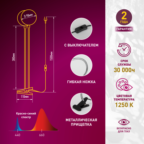 Красно-синий спектр свечения фитосветильника эффективен для вегетационного развития рассады, комнатных растений, выращивания цветов, ягод, завязи и вызревания плодов. По 24 светодиода на каждой из 2-х ламп. Мощность фитосветильника — 20 Вт. Эффективность — 22 мкмоль/с. Надёжный проверенный блок питания поможет фитосветильнику работать много лет. Качественные светодиоды последнего поколения не перегорают и не теряют яркость со временем. Диаметр каждой из светодиодных плат — 98 мм. Длина стоек — 380 мм. Провод 1500 мм с удобным кнопочным выключателем.