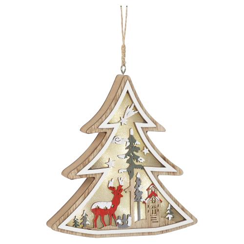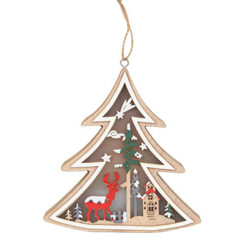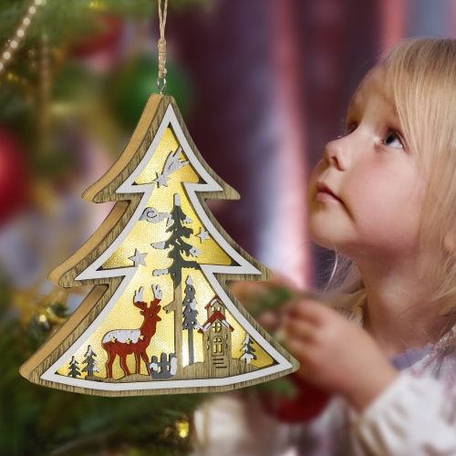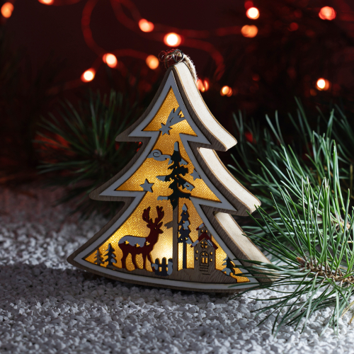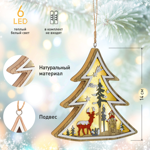Светодиодная фигурка "Елочка" (арт. Б0056010) преобразит интерьер любого дома. Чтобы создать в своем доме настоящую атмосферу тепла, уюта и праздника, достаточно просто зажечь фигурку и пространство комнаты заиграет по-новому. 6 экономичных и долговечных светодиодных лампочек, встроенных в украшение, создают особое теплое белое свечение, не создающее дискомфорта для глаз. Высота украшения составляет 14 см, что позволяет не только подвесить его, но и использовать его как ночник в детской комнате - он безопасен и не издает никакого лишнего шума. Новогодний светильник питается от 3 батареек ААА и экономичен благодаря LED-лампам. Декоративный светильник украшен тематическими новогодними рисунками елок, заснеженной полянки, Деда Мороза и оленей - такой принт отлично подойдет для праздника. Купив новогоднее украшение ЭРА вы останетесь довольны и сможете создать праздничную атмосферу в доме!
