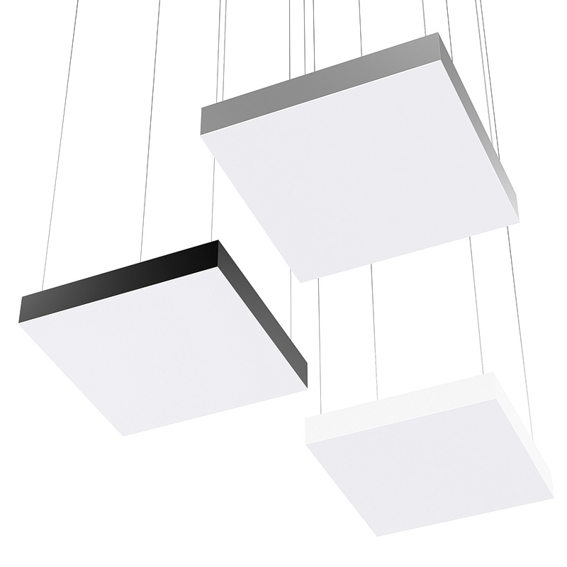 Корпус больших квадратных светильников может быть выполнен в черном и белом цвете. Цветовая температура на выбор: теплый цвет (3000К), нейтральный (4000К) или холодный (6500К). Материал корпуса – металл, размеры на выбор. Вариант монтажа – подвесной. Размеры, форму и мощность можно выбрать, так как модель изготавливается на заказ.