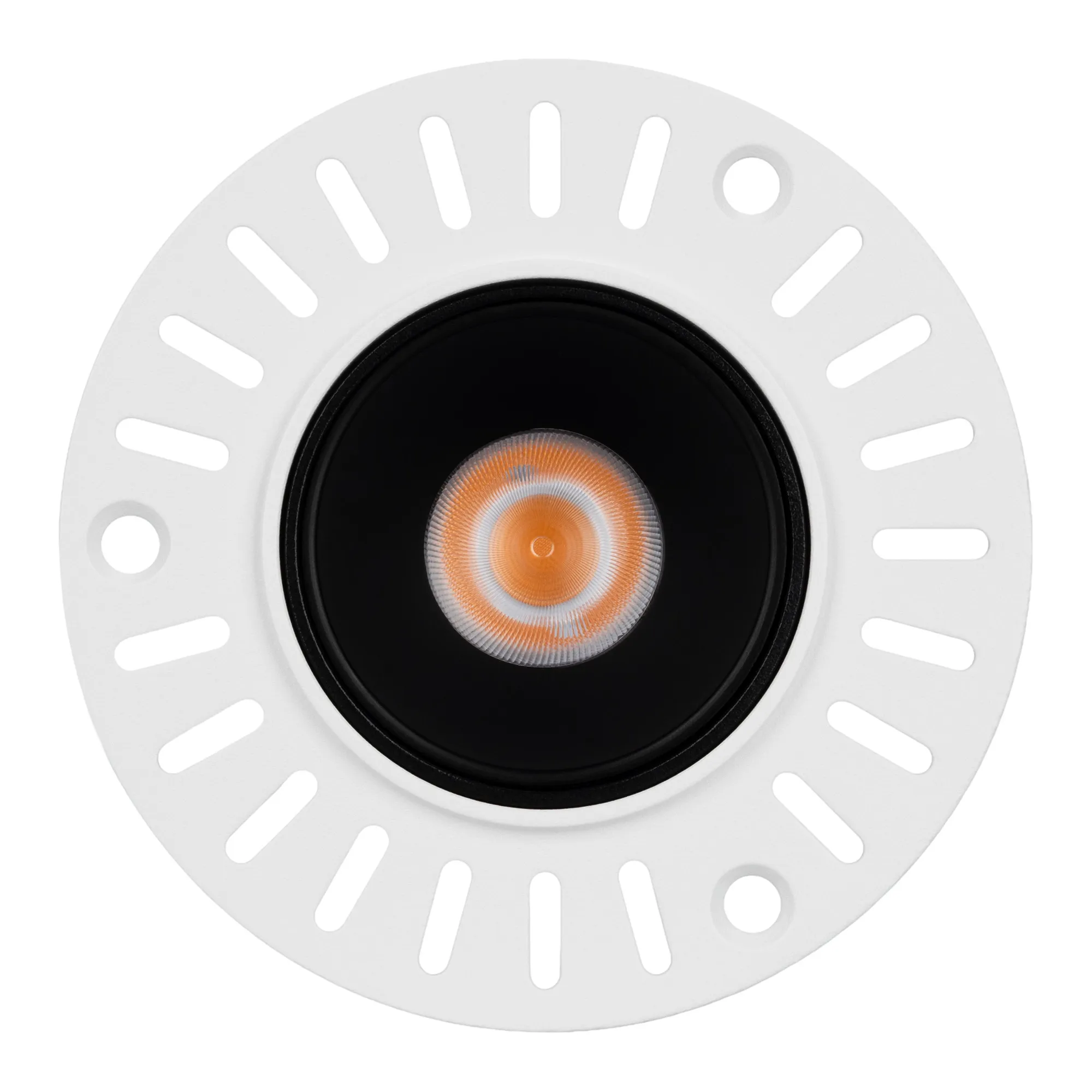 Встраиваемый безрамочный светильник под шпаклевку мощностью 8.4 Вт. Предназначен для освещения жилых, офисных, торговых и других помещений. Теплый белый цвет свечения (3000 К) и световой поток 700 лм. Заглубленная оптика ограничивает боковое излучение, тем самым исключая появление ослепляющего эффекта. Высокий индекс цветопередачи (CRI>90) и узкий угол излучения 32° для локального освещения. Светильник встраивается в установочное отверстие диаметром 65 мм. Драйвер в комплекте для подключения к сети 230 В.