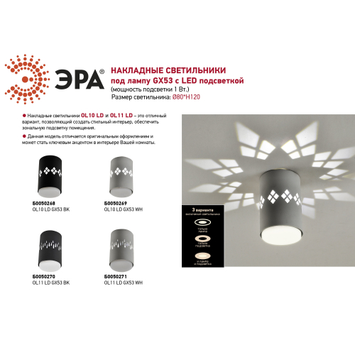 Накладной светильник OL10 LD GX53 BK отичается оригинальным оформлением и может стать ключевым акцентом в интерьере комнаты. Имеет три варианта включения: только лампа, только подсветка, лампа и подсветка. Цоколь для источника света GX53, напряжение питания 220В ~50/60Гц, материал алюминий, цвет светильника черный, размер D80*H120, максимальная мощность лампы 15 Вт LED, степень защиты IP20, цветовая температура 6 000К