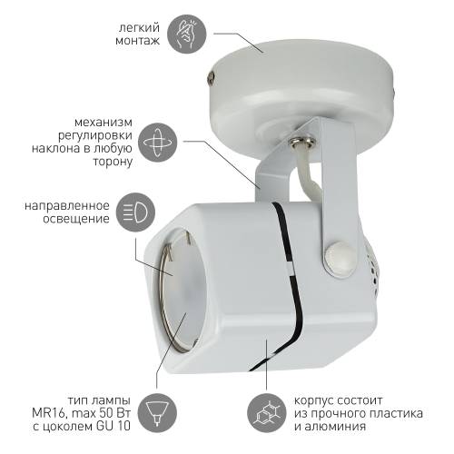 Светильник OL3 GU10 WH направленного света подчёркивает структуру материалов стен. Имеет несложное техническое обслуживание (легкость замены ламп и др.), механизм регулировки наклона в любую сторону. Цоколь для источника света GU10, напряжение питания 220В ~50/60Гц, материал металл + пластик, цвет светильника белый, размер D60*L95*H120, максимальная мощность лампы 50 Вт, степень защиты IP20