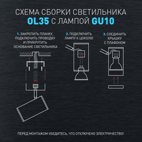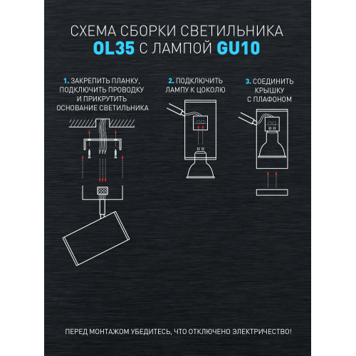 Светильник OL35-3 BK применяется для акцентного освещения и светового зонирования помещений. Может так же использоваться как основной источник света. Универсальный дизайн и небольшой размер светильника позволяют устанавливать его в помещениях любых типов и предназначений. Цоколь для источника света GU10, напряжение питания ~230В 50/60Гц, материал алюминий, железо, цвет светильника черный, хром, размер D55*100*3мм, максимальная мощность лампы 3*12Вт, степень защиты IP20