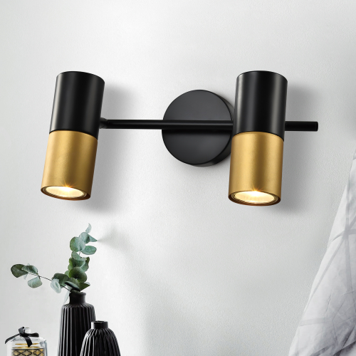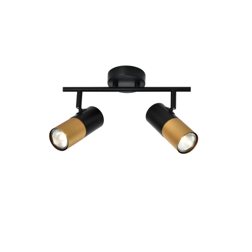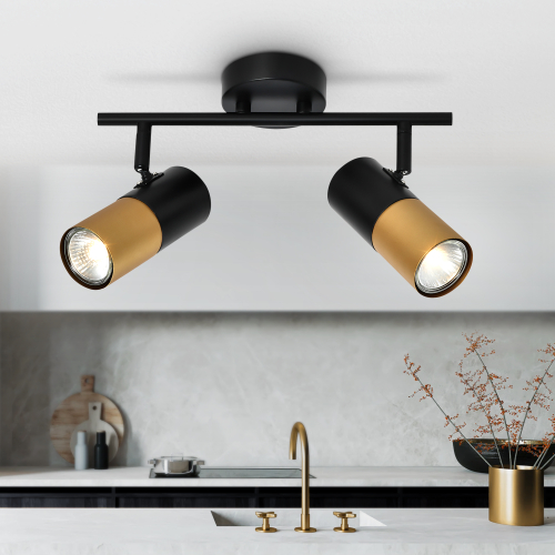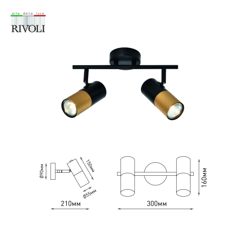 Спот поворотный Rivoli под 2 лампы эффектно смотрится в современных интерьерах. Это отличный вариант для организации дополнительного освещения в спальне, в гостиной, в кабинете, на кухне. Двухцветные (чёрный + золотой) плафоны расположены на лаконичной металлической рейке чёрного цвета.