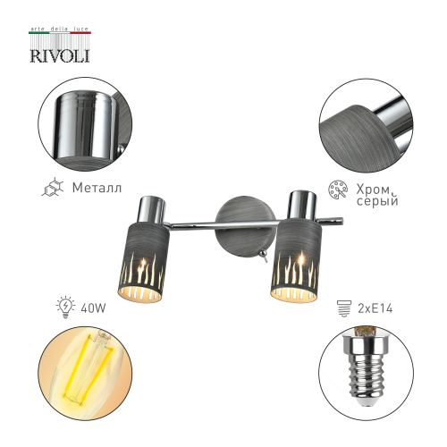 Rivoli Lethe с 2 металлическими плафонами (арт. 3123-312) - светильники настенные с выключателем на корпусе и возможностью регулировки направления света. Источники света для данных бра на стену - Е14 40 Вт. На поворотных плафонах бра есть перфорация в природных мотивах. Цвет спота накладного Lethe - серый с хромированными деталями. Перфорированные плафоны из металла объединяет лаконичная металлическая рейка. Миниатюрный выключатель расположен на корпусе светильника настенного. Включать и выключать бра над кроватью, бра в спальне, бра на стене кухни Rivoli Lethe очень удобно. Дизайн накладного спота Lethe создан итальянским брендом Rivoli. Перфорация в экостиле украшает плафоны и создает световую игру при включенных лампах. Споты настенные Lethe Rivoli освещают площадь 6 м2.