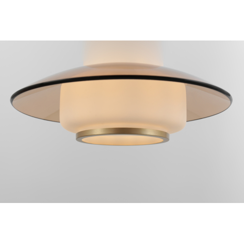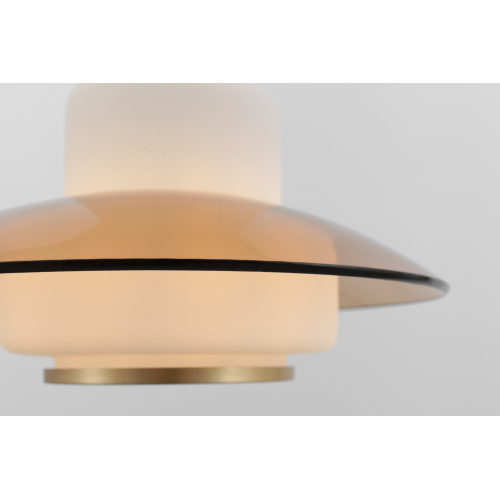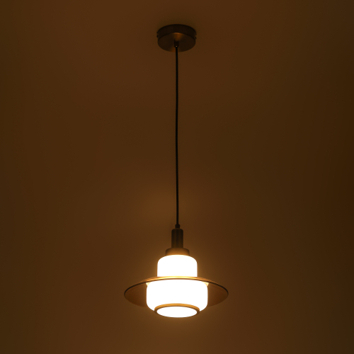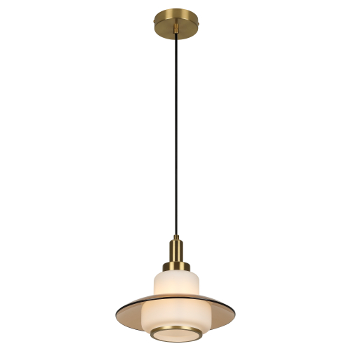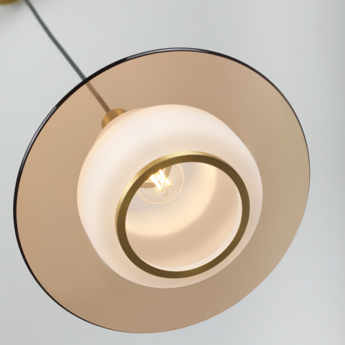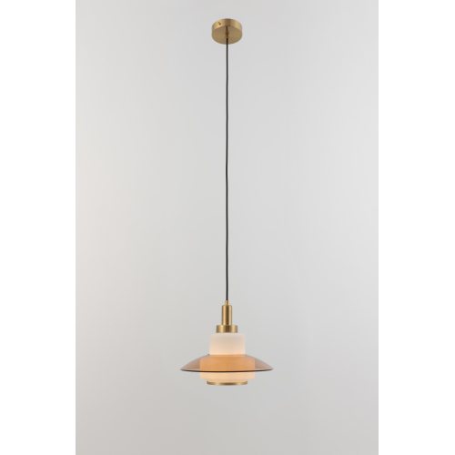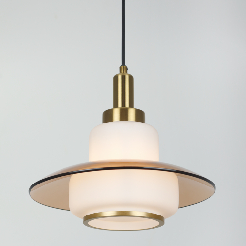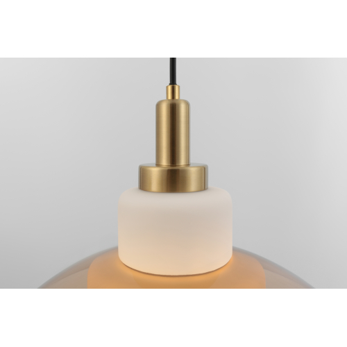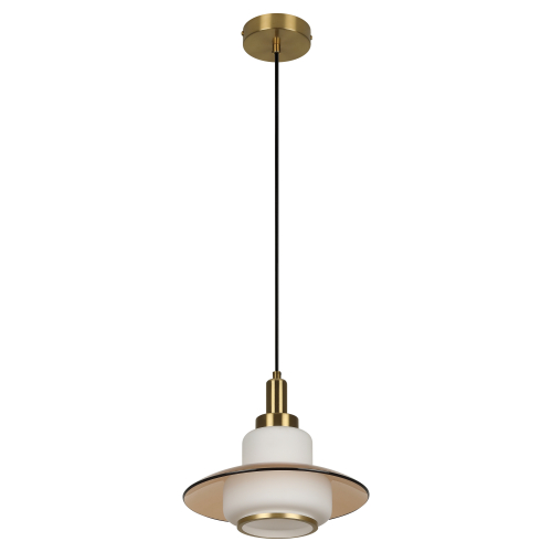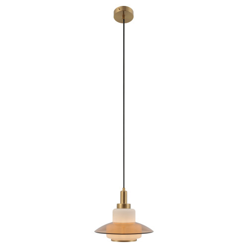 Плафон выполнен в гармоничном сочетании белого стекла и прозрачного стекла с тёплым тонированием. Акценты золотого цвета придают этому подвесному светильнику завершённость. Стеклянный плафон хорошо пропускает свет лампы, мягко рассеивая освещение. Высоту троса можно отрегулировать для реализации различных задач организации освещения.