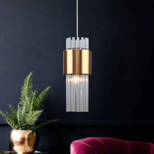 Подвесной светильник Rivoli Donna (арт. 3149-201) под лампу Е14 мощностью 40 Вт. Подвесной цилиндрический плафон из прозрачных стеклянных трубочек отлично пропускает свет, качественно подсвечивая столешницу. Освещаемая площадь данной подвесной люстры – до 3 м2. Металлические элементы цвета французское золото гармонично дополняют стекло и придают этой люстре подвесной в стиле модерн богемное настроение в современных интерьерах. Если вы любите классику и при этом хотите создать трендовый интерьер, стоит купить золотой подвес, золотой светильник подвесной Rivoli Deborah.