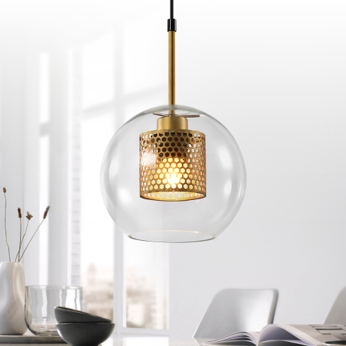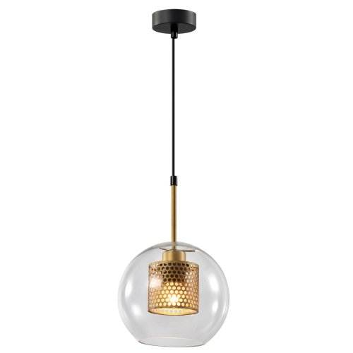 Внешний плафон светильника подвесного Gertrude представляет собой прозрачный шар, внутренний плафон – золотого цвета, с эффектной перфорацией в виде пчелиных сот.