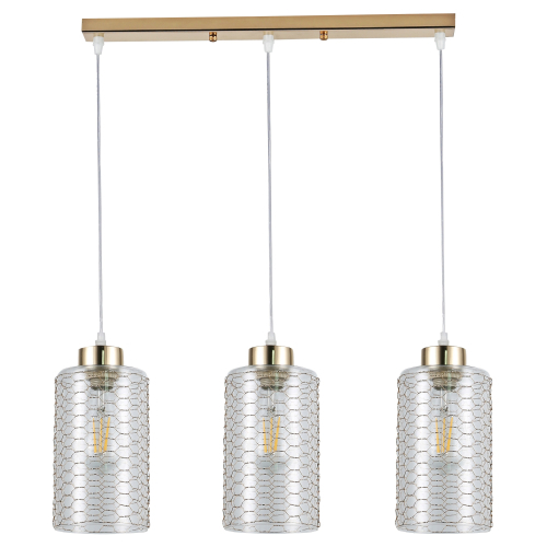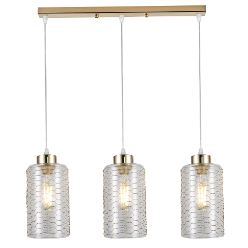 Malice (арт. 9124-203) - подвесной светильник потолочный с 3 прозрачными плафонами-стаканчиками. Плафоны из качественного закаленного стекла декорированы золотой "паутинкой", формирующей узор пчелиных сот. Подвесные светильники Malice от европейского бренда Rivoli идеальны для кухни, прихожей, гостиной, спальни и часто применяются в профессиональных дизайн-проектах. Стиль этих подвесных светильников на тросах - модерн. Высоту подвеса легко отрегулировать при установке светильника.