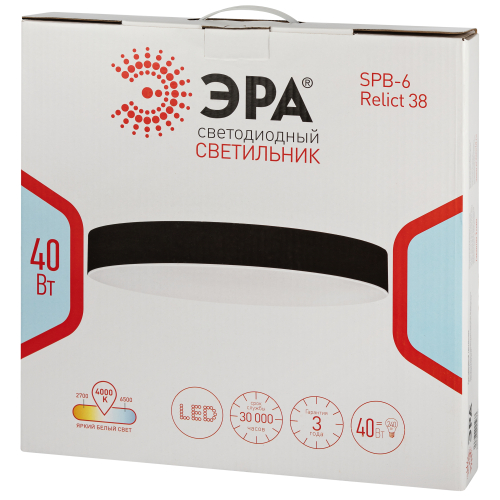 Потолочный светильник ЭРА SPB-6 Relict в чёрном цвете - арт. Б0059511. Диаметр - 38 см. Мощность - 40 Вт. Температура света - 4000 К: нейтральный белый, приближенный к естественному дневному. Такая цветовая температура идеальна для освещения как жилых пространств, так и коммерческих площадей. Светильник на потолок имеет минималистичный дизайн. Внешнее кольцо выполнено из метала с порошковым окрашиванием. Светильник потолочный не имеет рамок, обрамляющих рассеиватель с лицевой стороны, что придаёт ЭРА Relict эстетичный внешний вид. Благодаря простому конструктиву удалось добиться выгодной цены, при этом ЭРА SPB-6 Relict по своей надёжности и внешнему виду не уступает более дорогим вариантам на рынке. Новый конструктив не влияет на долговечность и функциональность светильника.