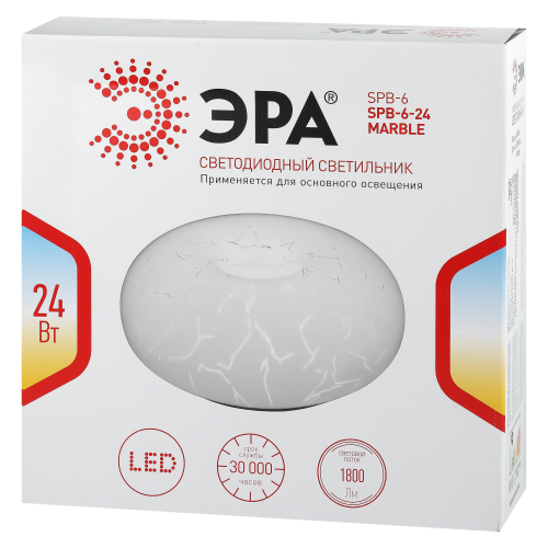 Светодиодный светильник ЭРА SPB-6 - 24 серии Marble привнесет в интерьер неповторимую атмосферу изысканности. Рассеиватель светильника выполнен в классическом белом цвете, украшен узорами, напоминающими мраморные, идеально впишется практически в любую комнату. Белый светодиодный светильник будет особенно эффектно смотреться в сочетании с классическим дизайном гардин и стен. Основание светильника выполнено из металла. Источником света служит LED модуль, срок службы которого составляет 30 000 часов. Цветовая температура светильника - 4000К, что соответствует белому свету, и наиболее комфортна для человека. Диаметр рассеивателя составляет 32 см, мощность лампы - 24 Вт. Потолочный светодиодный светильник одинаково элегантно смотрится во включенном и выключенном состоянии, привносит уют и тепло в домашнюю обстановку.