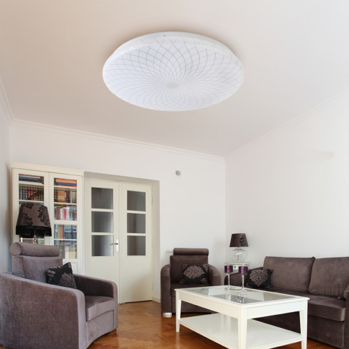 Плафон потолочной люстры выполнен из матового пластика, защищающего от воздействия прямого света. Рассеиватель декорирован блестящим узором, напоминающим солнце. Неповторимый дизайн идеально гармонирует с круглым плоским корпусом светильника и создает атмосферу уюта. Это позволяет использовать SPB-6 "Slim 3" 12-4K для освещения прихожей, гостиной или спальни.