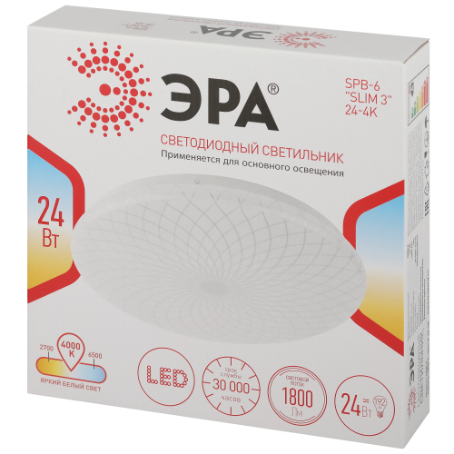 Изящный потолочный светильник SPB-6 "Slim 3" 24-4K от бренда ЭРА прекрасно дополнит любое дизайнерское решение! Наружный диаметр составляет 25 см. Стальной корпус светодиодной люстры обладает противоударными свойствами и отделан глянцем.