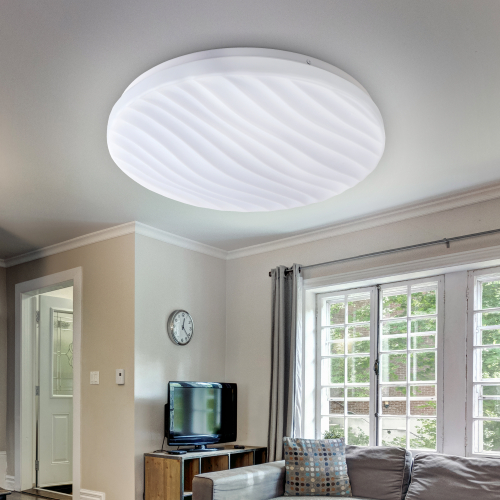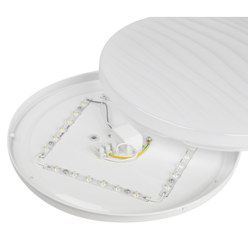 Рельефный дизайн рассеивателя, напоминающий морские волны, идеально сочетается с круглым плоским корпусом. За счет этого электросветильник освежит интерьер гостиной, спальни или прихожей.