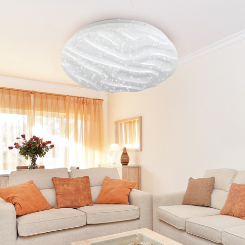 Лаконичный дизайн плафона в виде фактурных волн идеально сочетается с круглым плоским корпусом. За счет эффекта звездного неба в помещении можно создать оригинальную атмосферу. Такой потолочный LED светильник разнообразит интерьер спальни, детской или гостиной.
