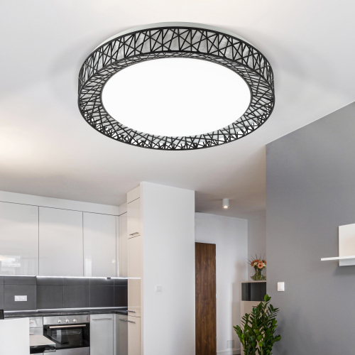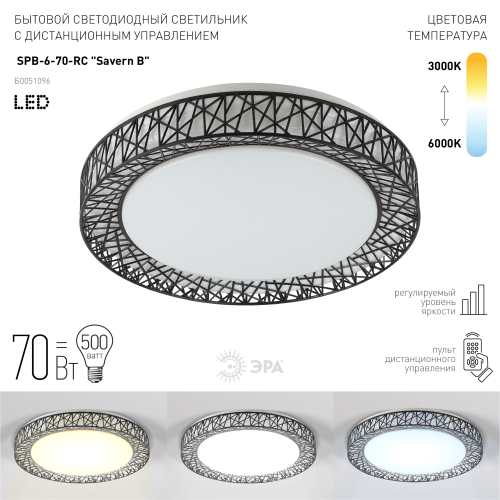 Эффектный светодиодный светильник ЭРА SPB-6-70-RC серии Savern В станет запоминающейся деталью любого интерьера. В его дизайне выделяется контрастная декоративная решетка, обрамляющая белый рассеиватель, она создает неповторимый эффект во включенном режиме. Яркость и цветовую температуру светильника можно регулировать, в чем поможет пульт дистанционного управления, входящий в комплект. Цветовая температура данной модели регулируется в пределах от 3000 К до 6000 К. Основание светильника выполнено из металла, на котором расположен LED-модуль и современный безопасный драйвер. Диаметр светодиодной лампы составляет 47 см, мощность лампы 70 Вт. Благодаря своим характеристикам светильник создаст неповторимую атмосферу в комнате, комфортную и уютную.