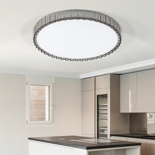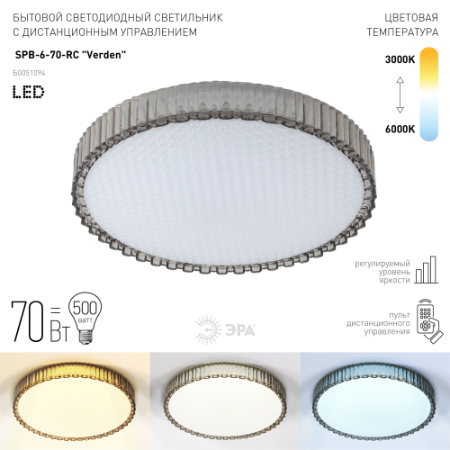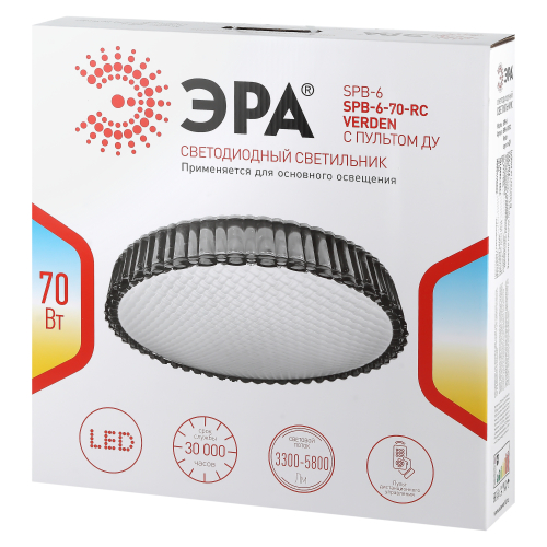 Светильник светодиодный потолочный ЭРА SPB-6-70-RC серии Verden станет настоящим украшением гостиной. Его отличает классический дизайн рассеивателя в эффектном обрамлении контрастных узоров. При включенной лампе свет мягко рассеивается, наполняя пространство особым домашним теплом. На стальном основании светильника расположена светодиодная плата, оснащенная современным и надежным драйвером. Диаметр светодиодной лампы составляет 50 см. Цветовая температура регулируется в зависимости от необходимости в пределах от 3000 К до 6000 К, яркость свечения также регулируется. Мощность лампы составляет 70 Вт, продолжительность службы 30000 часов. Светодиодный потолочный светильник ЭРА объединяет в себе современные технологии и классический изысканный дизайн.